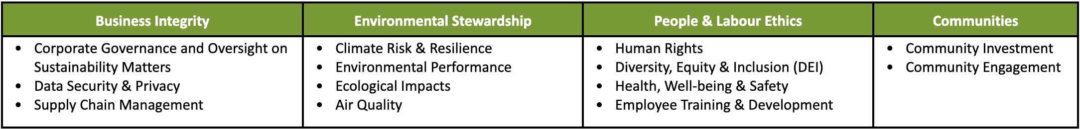 In line with our commitment towards our prioritised Sustainable Development Goals, Gaw Capital has identified a series of material sustainability topics within four Focus Areas of Business Integrity, Environmental Stewardship, People and Labour Ethics, and Communities that we incorporate within our investment approach and stewardship activities (please refer to our Sustainability Policy for details).