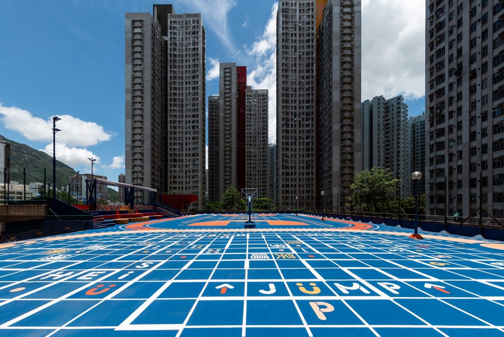 The design theme of the court is inspired by the name of the estate, Siu Hei, which rhymes with the Chinese – smile(笑) and laughter(嘻). Decorated with the bright and signature colour palette alongside bold graphics and custom typography, Siu Hei Sportsground is fueled with youthful and dynamic energy. At Gaw Capital, we hope to create more opportunities for people of different ages, abilities and interests to enjoy the space together.