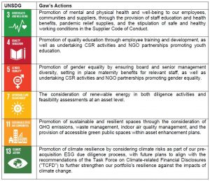 Gaw Capital is committed to contributing towards the United Nations Sustainable Development Goals (“SDGs”), and embraces the values of the SDGs to address global challenges and build a resilient strategy. We have identified the below six priority SDGs against which we have taken the following actions: